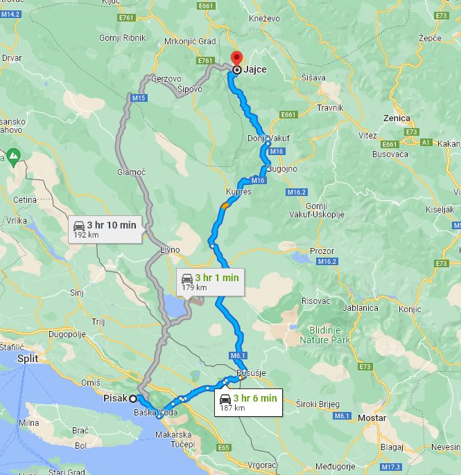 We at Monterrasol Transfers specialize in private car transfers. Our focus is long distance inter-city transfers, including inter-country transfers. Here on this page you can see the price and details for private car transfer from Pisak, located in Croatia, to Jajce, located in Bosnia-Herzegovina. Together with the transfer from Pisak to Jajce itself, we propose you visit some beautiful places along the transfer route. We call such places optional sightseeing stops (short excursions). Each sightseeing stop is provided with a price and a suggested time to spend there. Transfer detailsThe price is for a ride, not per person. If you plan to return on the same day, our driver can bring you back with a 20% discount. Each transfer back is case-by-case and depends on the total distance and waiting time. As a rule, we use for transfers a classic minivans, with 7 seats for passengers (one passenger in front, 3 passengers on the second row, and another 3 passengers on third row), where the trunk can accommodate 2 large suitcases and few handbags. Please be aware: