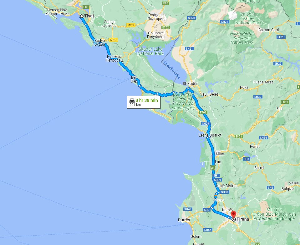 We at Monterrasol Transfers specialize in private car transfers. Our focus is long distance inter-city transfers, including inter-country transfers. Here on this page you can see the price and details for private car transfer from Tivat, located in Montenegro, to Tirana, located in Albania. Together with the transfer from Tivat to Tirana itself, we propose you visit some beautiful places along the transfer route. We call such places optional sightseeing stops (short excursions). Each sightseeing stop is provided with a price and a suggested time to spend there. Transfer detailsThe price is for a ride, not per person. If you plan to return on the same day, our driver can bring you back with a 20% discount. Each transfer back is case-by-case and depends on the total distance and waiting time. As a rule, we use for transfers a classic minivans, with 7 seats for passengers (one passenger in front, 3 passengers on the second row, and another 3 passengers on third row), where the trunk can accommodate 2 large suitcases and few handbags. Please be aware: