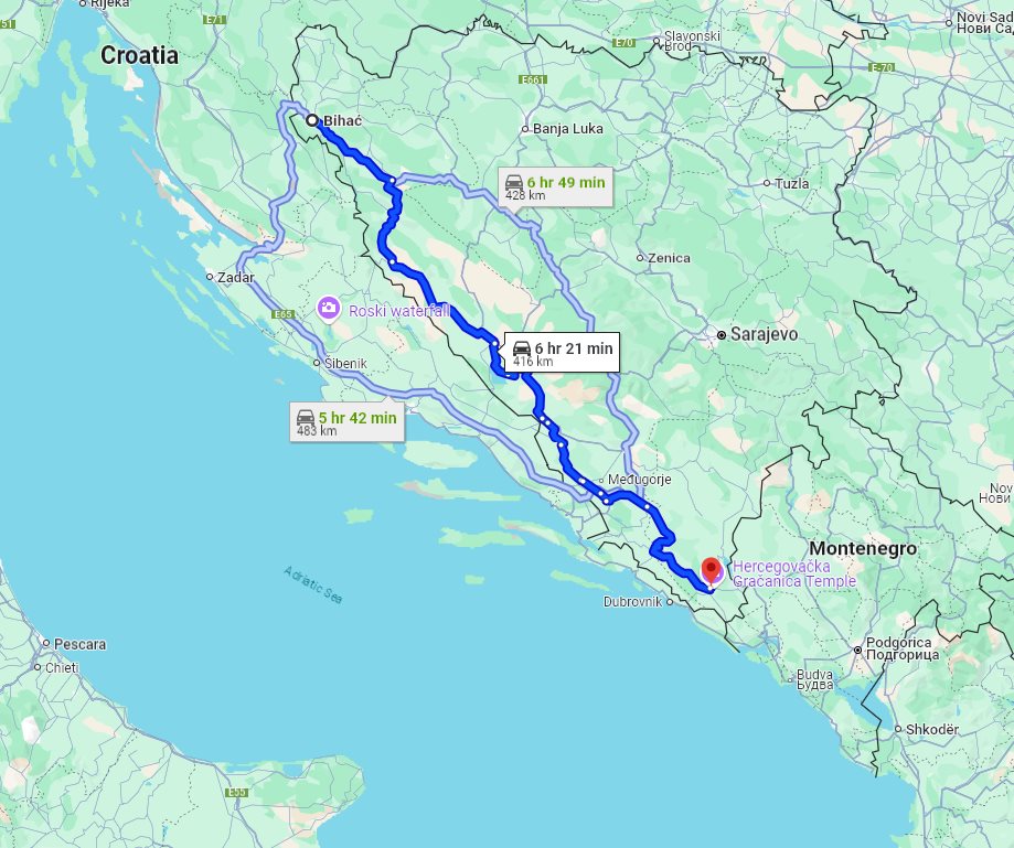 What about to visit some sights along the way?Please, add no more than 3 places. Thank you. Blagaj, Bosnia-HerzegovinaKnown for architecture, bridge, cave, fortress, landmark, museum, river, viewpoint, islam monastery; monastery is a UNESCO Tentative List Site Recommended time to visit: 60 min