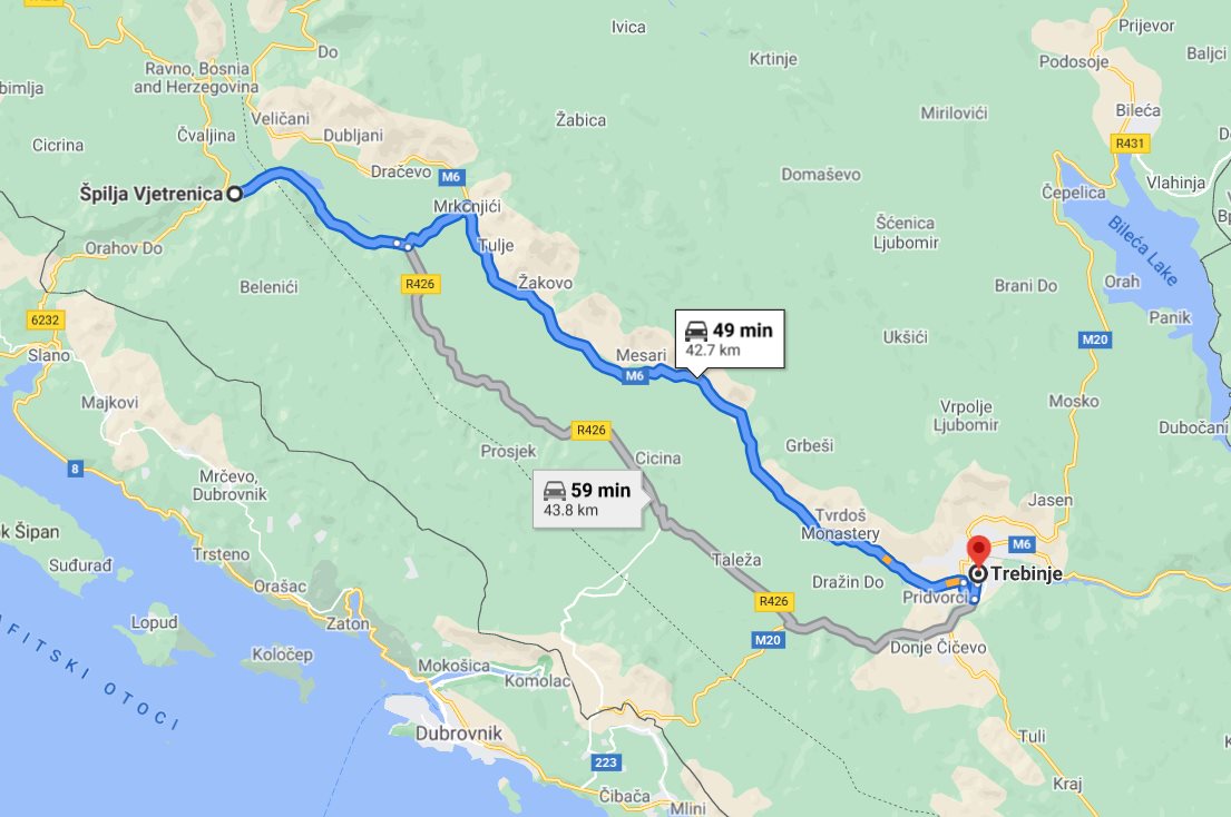 We at Monterrasol Transfers specialize in private car transfers. Our focus is long distance inter-city transfers, including inter-country transfers. Here on this page you can see the price and details for private car transfer from Vjetrenica cave to Trebinje, both located in Bosnia-Herzegovina. Together with the transfer from Vjetrenica cave to Trebinje itself, we propose you visit some beautiful places along the transfer route. We call such places optional sightseeing stops (short excursions). Each sightseeing stop is provided with a price and a suggested time to spend there. Transfer detailsThe price is for a ride, not per person. If you plan to return on the same day, our driver can bring you back with a 20% discount. Each transfer back is case-by-case and depends on the total distance and waiting time. As a rule, we use for transfers a classic minivans, with 7 seats for passengers (one passenger in front, 3 passengers on the second row, and another 3 passengers on third row), where the trunk can accommodate 2 large suitcases and few handbags. Please be aware: