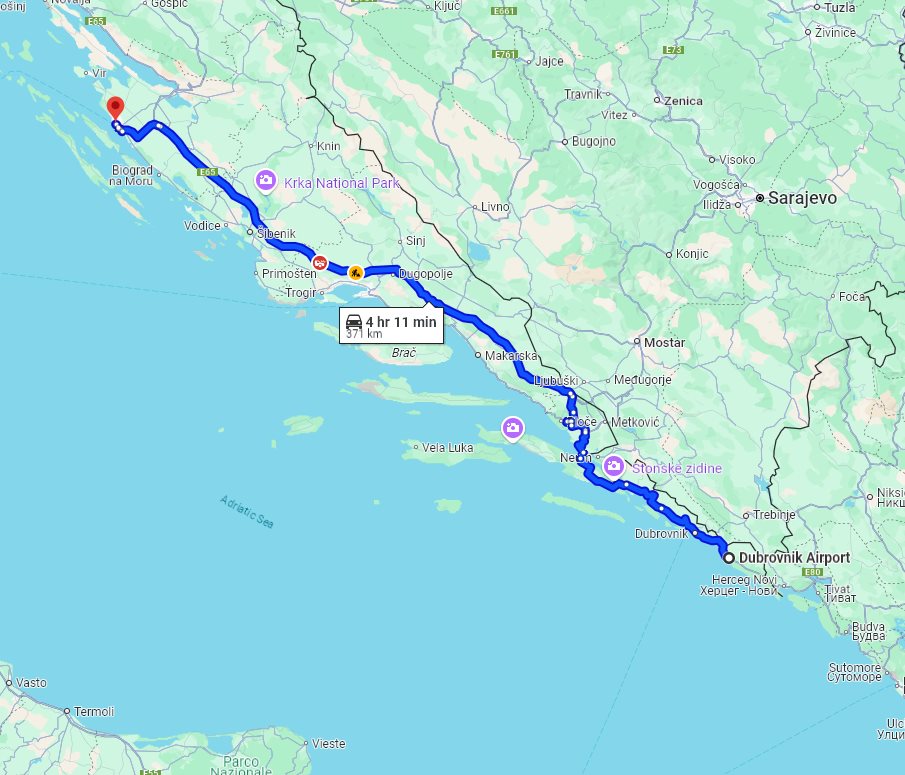 We at Monterrasol Transfers specialize in private car transfers. Our focus is long distance inter-city transfers, including inter-country transfers. Here on this page you can see the price and details for private car transfer from Dubrovnik airport Cilipi (Čilipi) to Zadar, both located in Croatia. Together with the transfer from Dubrovnik airport Cilipi (Čilipi) to Zadar itself, we propose you visit some beautiful places along the transfer route. We call such places optional sightseeing stops (short excursions). Each sightseeing stop is provided with a price and a suggested time to spend there. Transfer detailsThe price is for a ride, not per person. If you plan to return on the same day, our driver can bring you back with a 20% discount. Each transfer back is case-by-case and depends on the total distance and waiting time. As a rule, we use for transfers a classic minivans, with 7 seats for passengers (one passenger in front, 3 passengers on the second row, and another 3 passengers on third row), where the trunk can accommodate 2 large suitcases and few handbags. Please be aware: